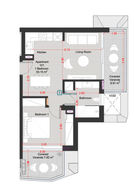 For sale is a modern off-plan apartment on the top floor, offering 53 square meters of well-designed internal space. This one-bedroom, one-bathroom residence is accessible via an elevator, making it convenient for everyday living. The property features a spacious layout with contemporary finishes and large windows that bring in natural light and showcase city views.